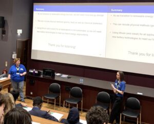 The day started with University of Cambridge alumna, now Programmes Manager at the Salters’ Institute, Dr Holly Smith introducing the students to her PhD research subject. Her insightful talk guided the room on a journey to discover the many types of batteries currently used in technology, before arriving at solutions for future, more sustainable options. Students demonstrated their engagement with the topic through their thoughtful questions in the Q&A session – asking everything from “What type of batteries do you think will be most common in the future?” to “How long does it take to develop new battery technology?”.